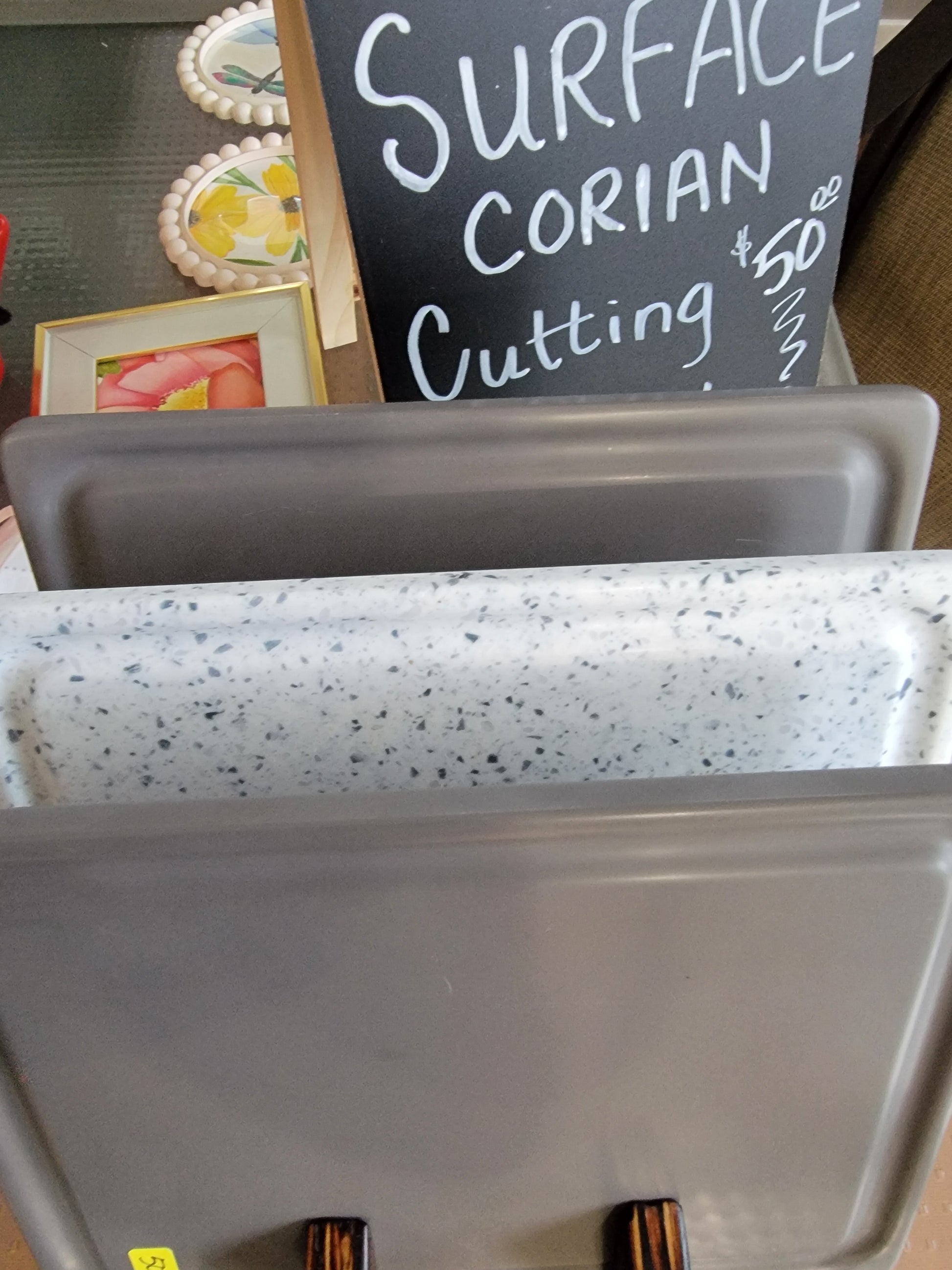 Corian Solid Surface cutting board with drip groove. Sanded to a satin gloss finish on all sides!. You will find similar items on Amazon with great reviews; The thing is Corian cutting boards are amazing but we think ours stand out from the rest due to the quality and finish. Made to last and can be refinished giving the board new life over and over. 8.5x10" is the perfect size for someone that does not want to lug around a giant board or dedicate a spot on the counter. We make ours from scrap pieces so our colors always vary making each piece one of a kind! Corian is a trusted product used in hospitals, kitchens, and bathrooms all around the world. These are non-porous and can be easily cleaned up along with your other dishes.